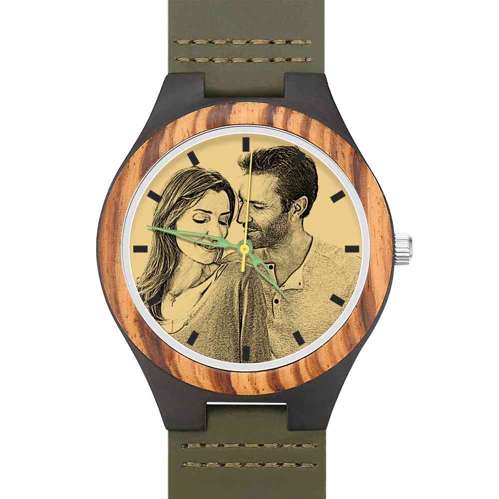 49% RABATTHerren Gravierte Hölzern Foto Uhr Dunkelgrün Lederband 45mm -