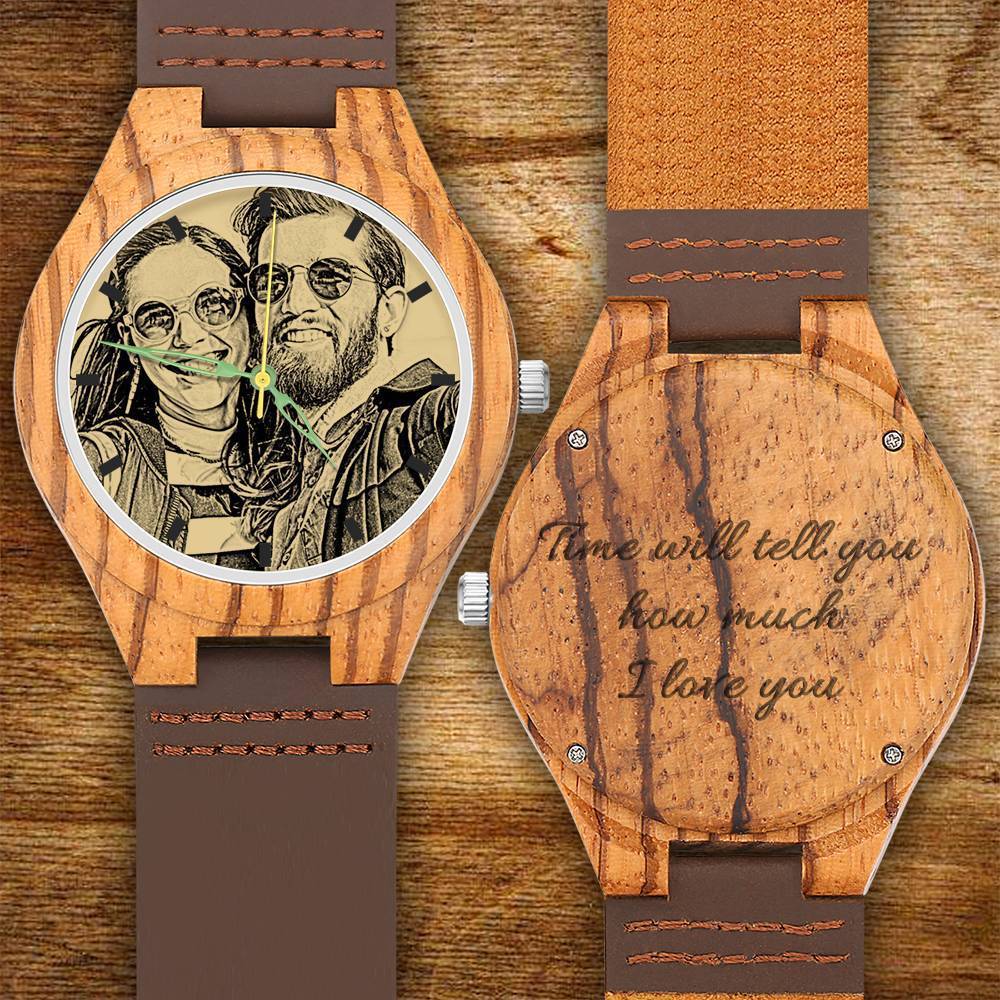 52% RABATTHerren Gravierte Hölzern Foto Uhr Braun Lederband 45mm -