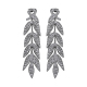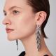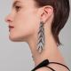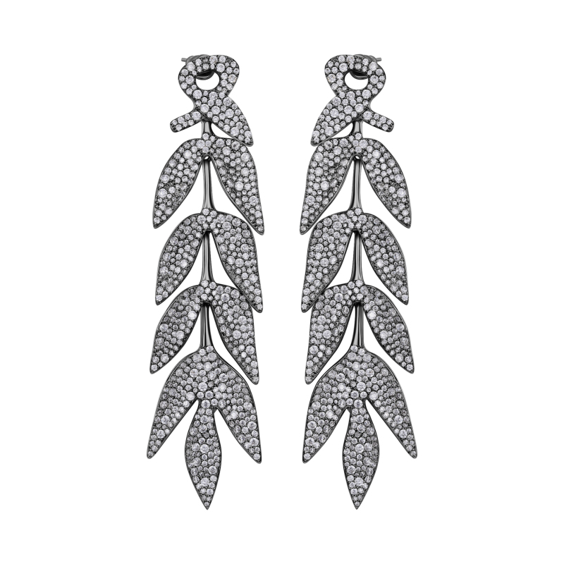 Das Produkt besteht aus Messing, das mit schwarzem Ruthenium beschichtet ist, und die Ohrringe sind in Form von Bambusblättern verbunden. Der Stein wird ohne transparenten Boden in schmucker Handwerkskunst von Hand gefasst. Die schwarze Farbe hebt den weißen Stein hervor und unterstreicht den Glanz des Steins. Es hat ein Schmuck-Temperament und ein elegantes und leichtes Design.