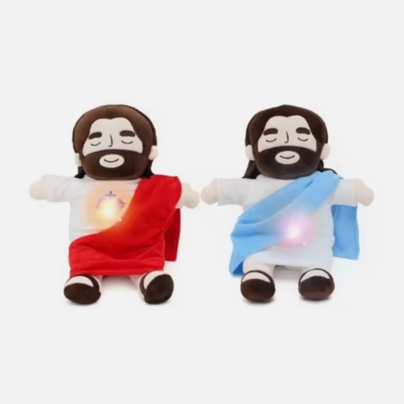Lassen Sie das beruhigende Heben und Senken unseres atmenden Jesus-Plüschtiers zu, um Ruhe in die Schlafenszeit Ihres Kindes zu bringen. Diese sanfte Bewegung hilft, ängstliche Gedanken und unruhige Nächte zu lindern und fördert ein tiefes Gefühl von Vertrauen und Ruhe beim Einschlafen. Größe: 25 x 25 x 40 cm.