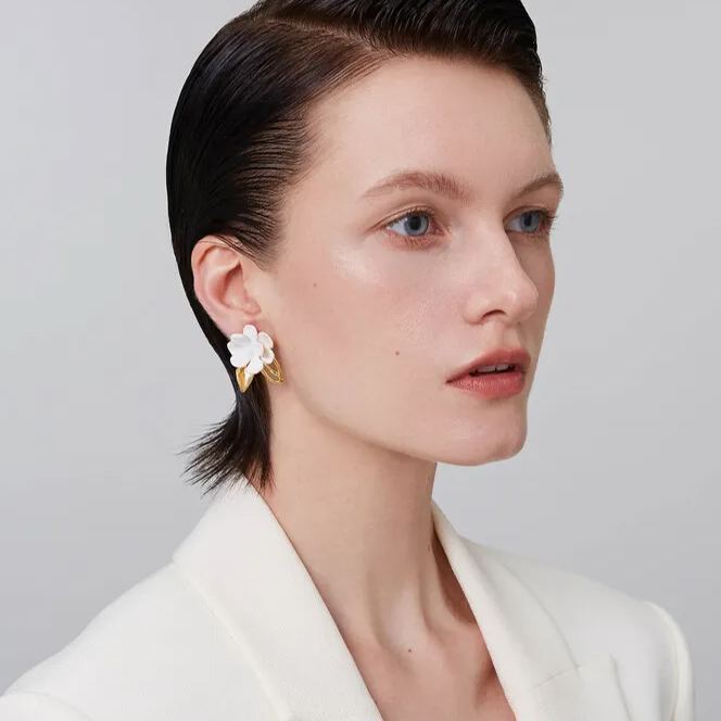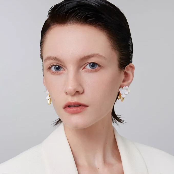 Kamelien-kollektion, Blume Mit Blatt-ohrsteckern, Weiße Emaille