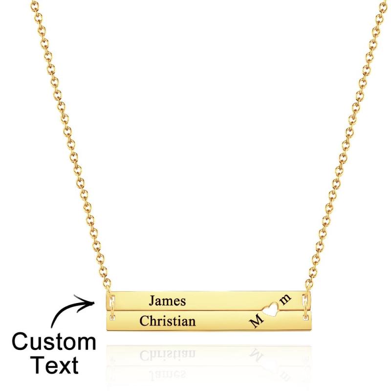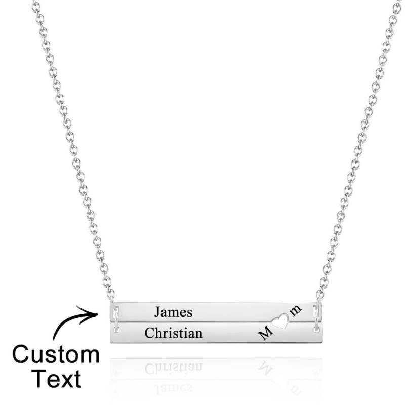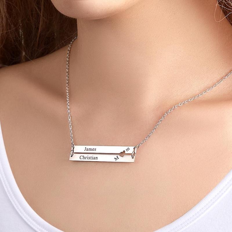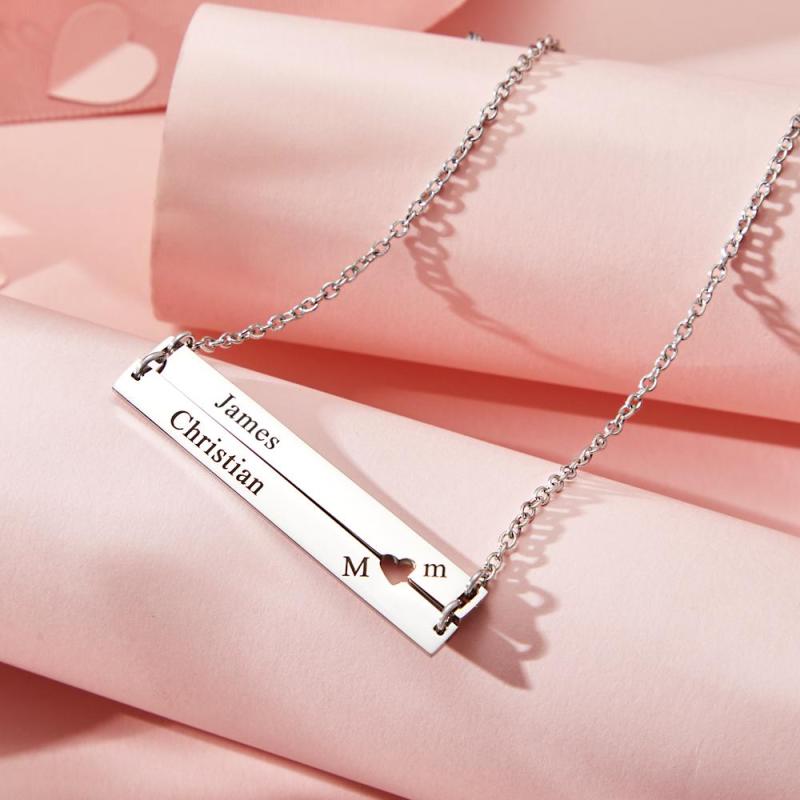 Individuell gravierte Halskette Bar-Halskette als Geschenk für die Mutter. Diese Halskette besteht aus zwei Streifen. Wenn die beiden Streifen miteinander kombiniert werden, werden Sie feststellen, dass es ein Herzmuster gibt. Sie können auch den Text auf der Leiste anpassen. Glauben Sie mir, wenn ich so eine Kette für Ihre Mutter anfertige, wird sie sich sehr freuen.