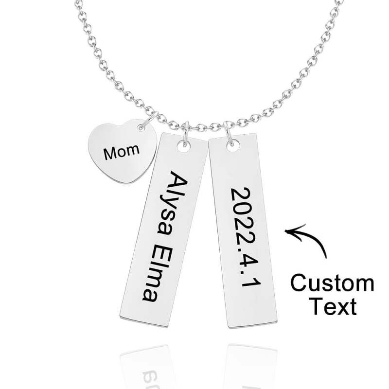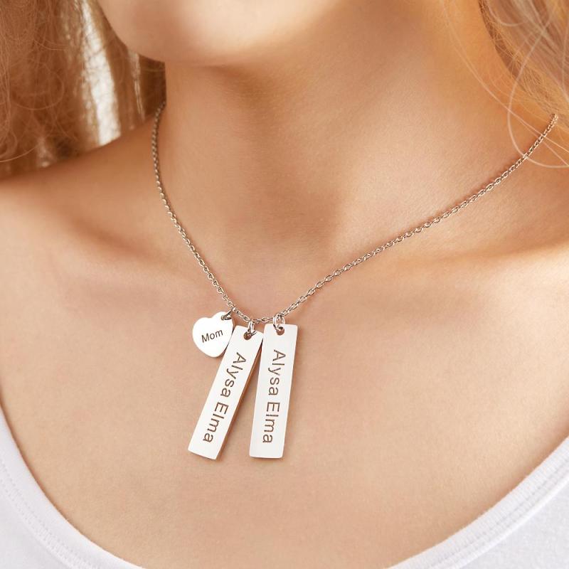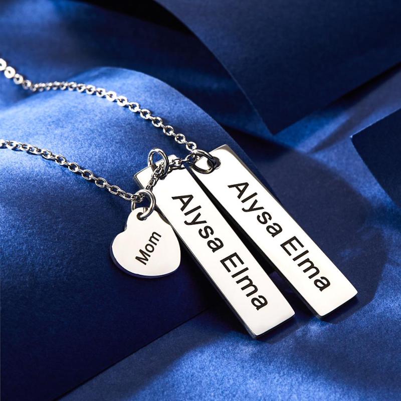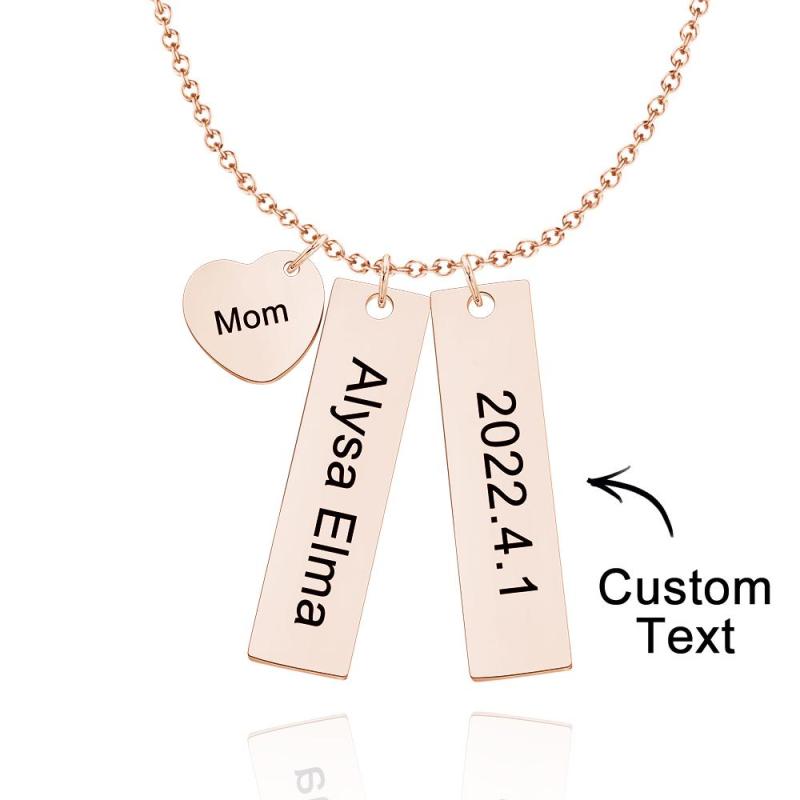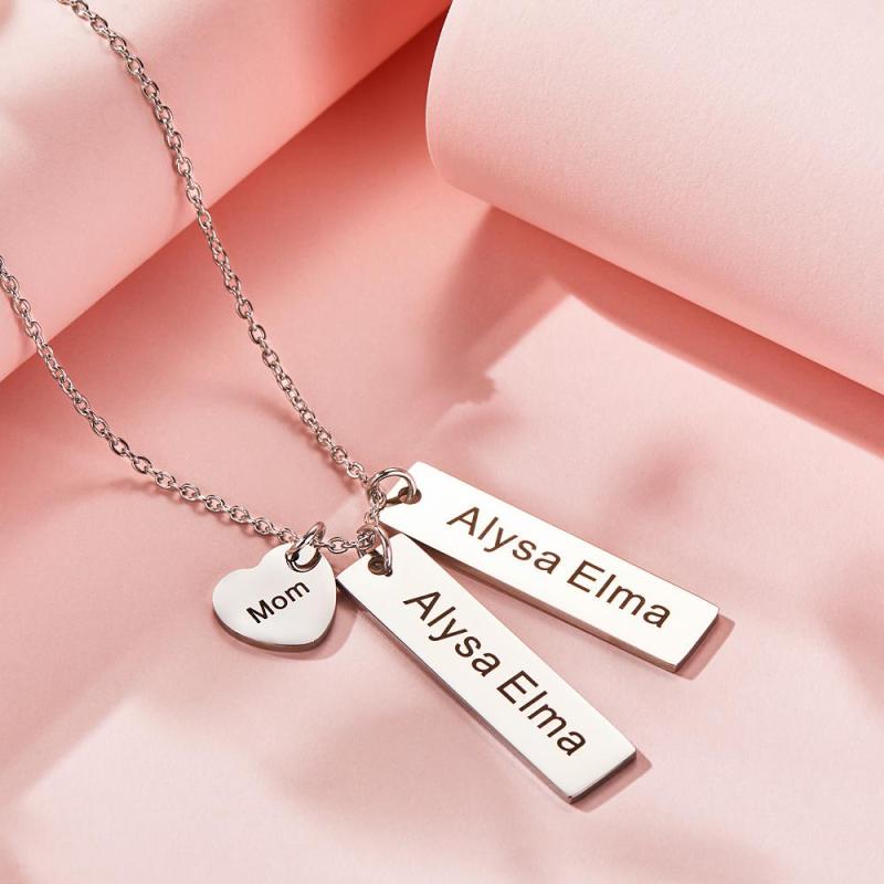 Halskette mit individuellem Schriftzug Die Halskette mit herzförmigem Schriftzug ist ein Geschenk für Mama. Diese Halskette besteht aus zwei Streifen und einem Herz. Sie können drei Farben wählen: Gold, Silber und Roségold. Sie können die Farbe auswählen, die Sie möchten, um den Text darauf anzupassen. Glauben Sie mir, Ihre Mutter wird sich sehr freuen, wenn ich ihr eine solche Halskette schenke.