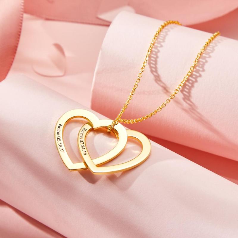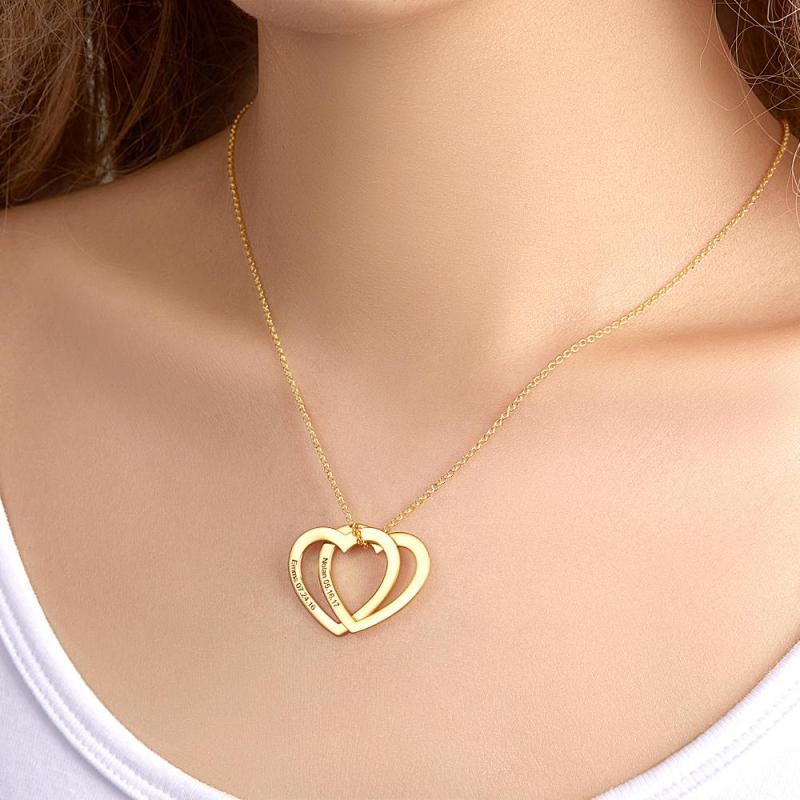 Individuell gravierte Halskette Zwei-Herz-Halskette als Geschenk für sie. Diese Halskette besteht aus zwei Herzen. Sie können den Text auf den zwei Herzen besonders anfertigen. Diese Halskette hat drei Farben: Gold, Silber und Roségold. Sie können eine Farbe auswählen, die Sie anpassen möchten, und sie ihr geben. Dieses Geschenk wird ihr gefallen.