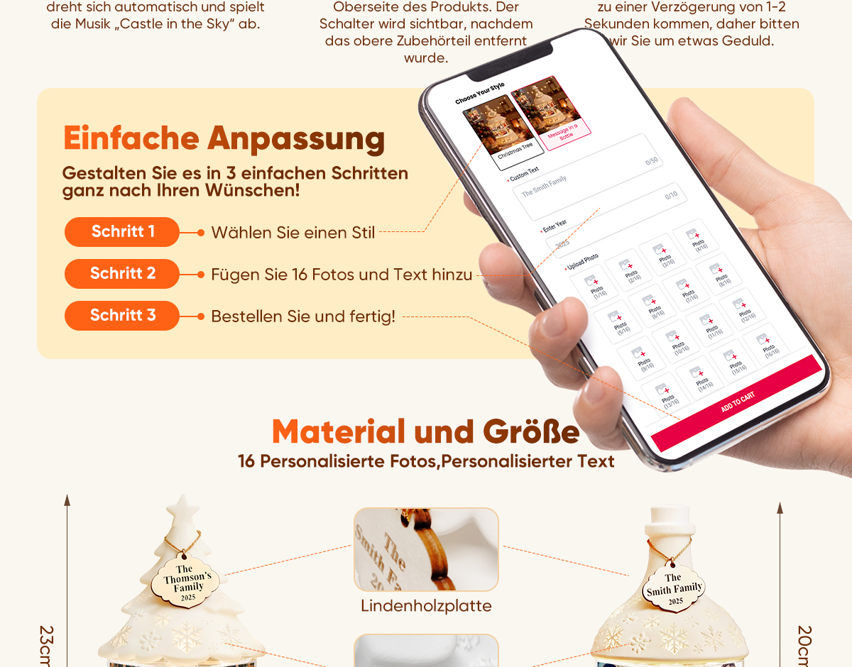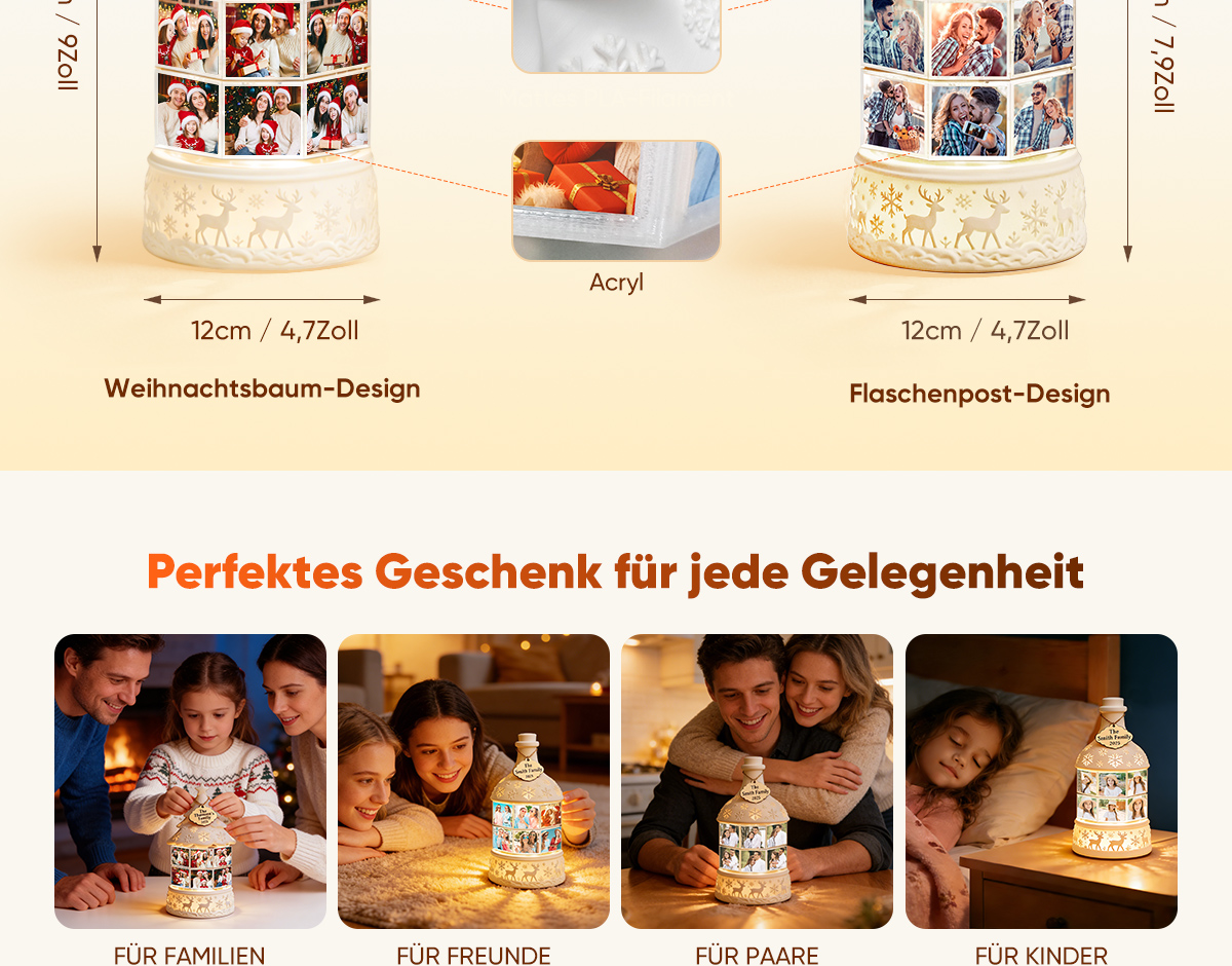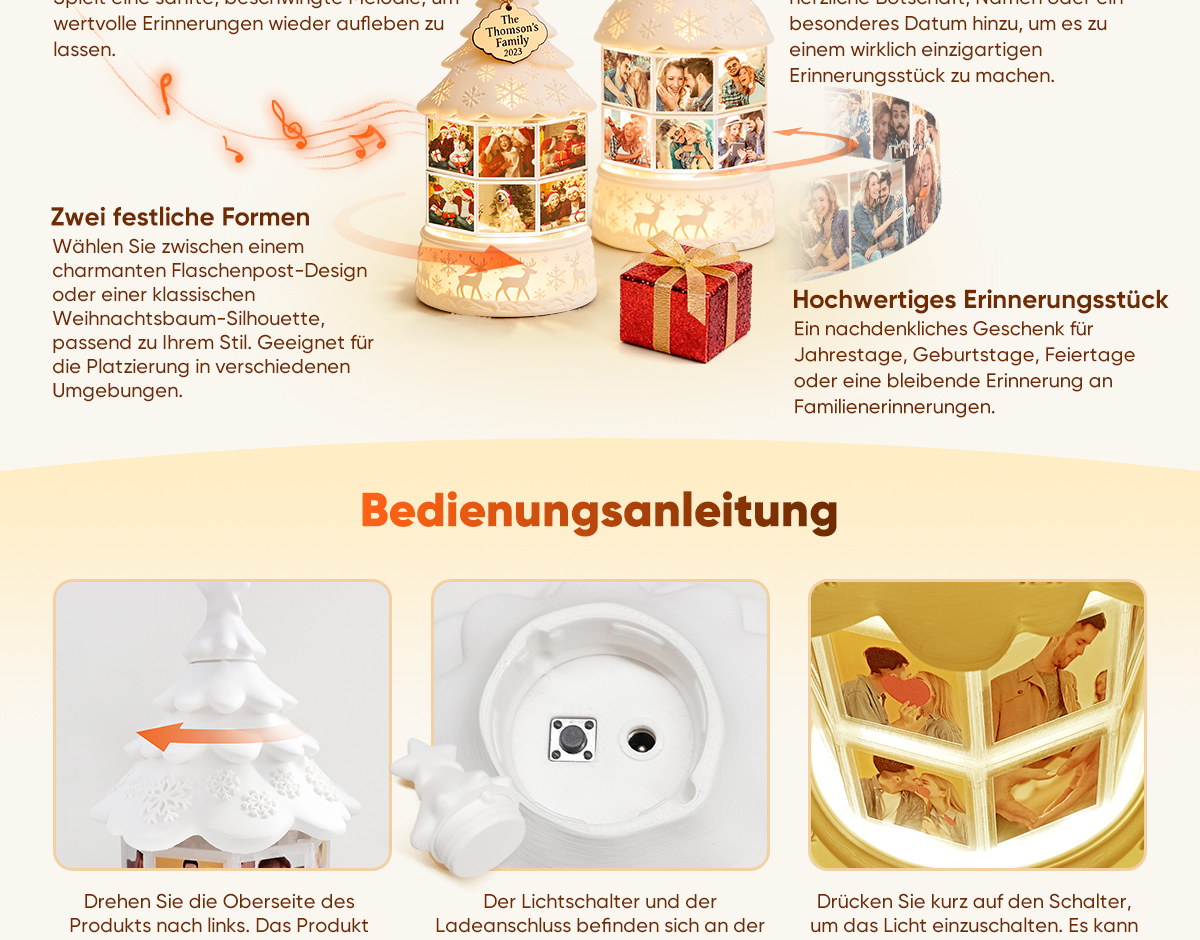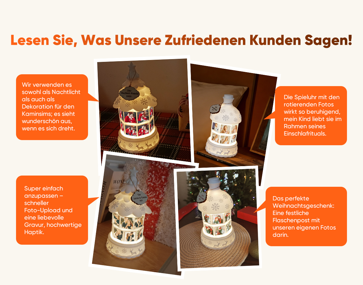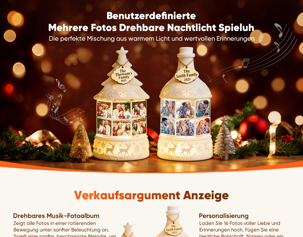 Verleihen Sie Ihren Feiertagen eine persönliche Note. Unsere personalisierbare, drehbare Nachtlicht-Spieluhr mit mehreren Fotos verbindet warmes, gemütliches Licht mit wertvollen Erinnerungen. Dieses einzigartige Nachtlicht zeigt nacheinander bis zu 16 hochgeladene Fotos und verwandelt Ihre schönsten Momente in eine sanfte, bewegte Diashow, die in jedem Raum ein stimmungsvolles Licht erzeugt.