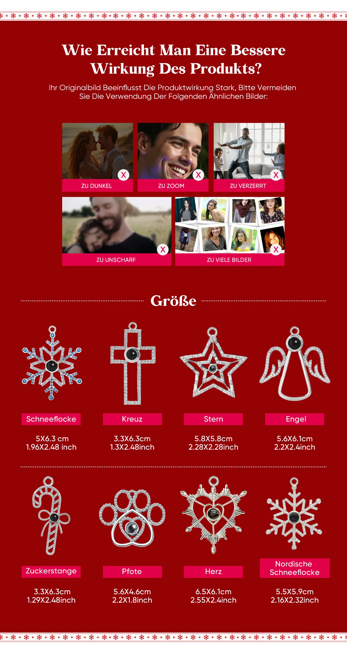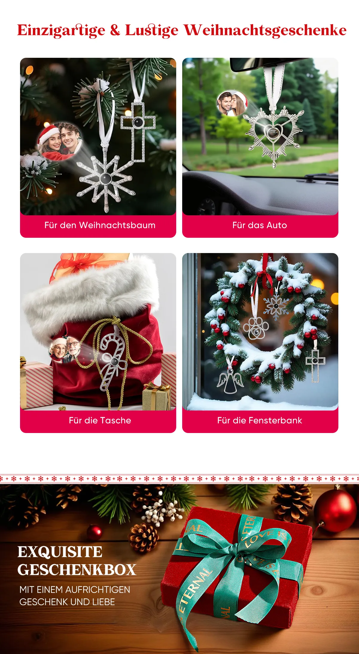 Halten Sie Ihre schönsten Erinnerungen in dieser Weihnachtszeit mit unseren individuell gestaltbaren Fotoprojektions-Ornamenten fest. Diese exquisiten Christbaumkugeln vereinen persönliche Botschaften mit funkelnder Lichtprojektion und verwandeln jedes Foto in ein strahlendes Herzstück Ihrer Dekoration.