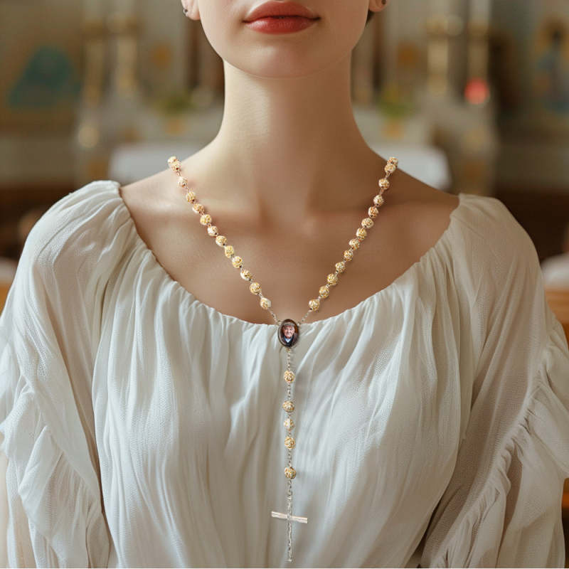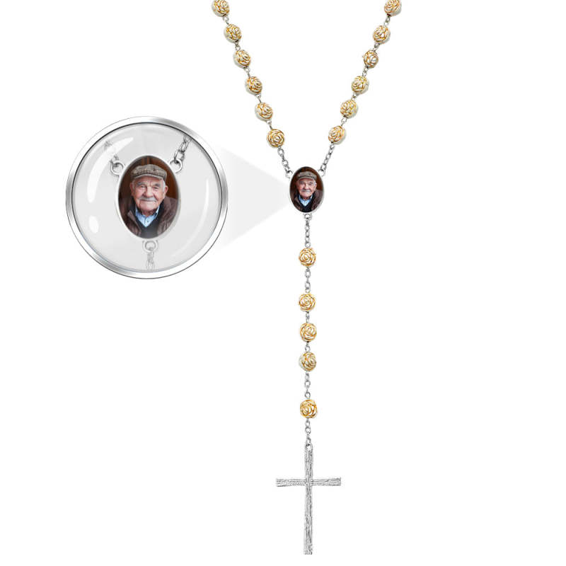 Personalisierte Rosenkranz-kreuz-halskette, Personalisierte Goldene Rosen-perlen-halskette Mit Foto