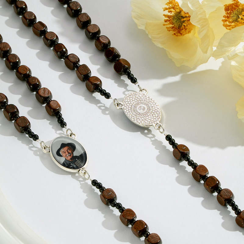 Personalisierte Rosenkranz-kreuz-halskette, Personalisierte Quadratische Holzperlen-halskette Mit Foto