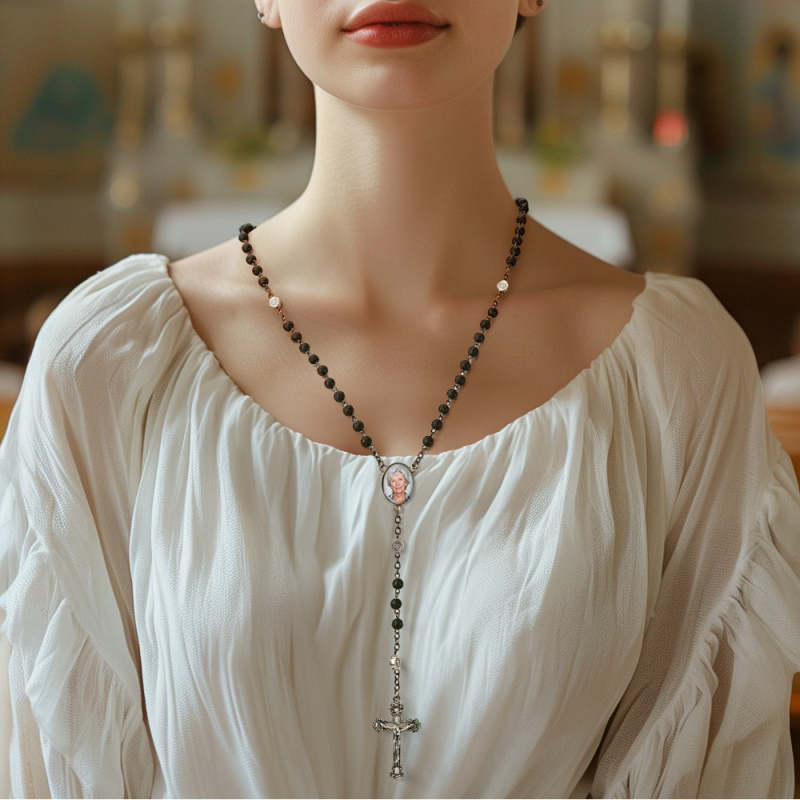Personalisierte Rosenkranz-kreuz-halskette, Personalisierte Vulkanstein-halskette Mit Foto