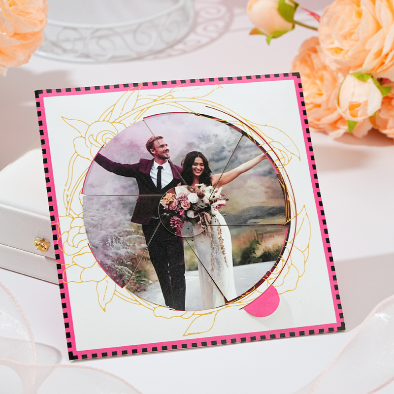 Halten Sie den Moment mit einer persönlichen Note fest. Unsere individuelle Foto-Drehkarte besticht durch ihr einzigartiges Doppelbild-Design, das sich dreht und zwei wertvolle Fotos auf einer eleganten Karte enthüllt. Perfekt für Hochzeiten, Jubiläen oder einfach immer dann, wenn Sie ein besonderes Andenken verschenken möchten. Dieses aus hochwertigen Materialien gefertigte, Social-Media-taugliche Andenken verbindet eine liebevolle Botschaft mit einem verspielten Mechanismus und macht es zu einem unvergesslichen Hochzeitsgeschenk oder einer Karte für besondere Anlässe. Laden Sie einfach Ihre ausgewählten Fotos hoch, und wir erstellen eine nahtlose Doppelbild-Grußkarte, die sich sanft dreht, um jedes Bild anzuzeigen – zwei Botschaften, ein unvergessliches Geschenk.