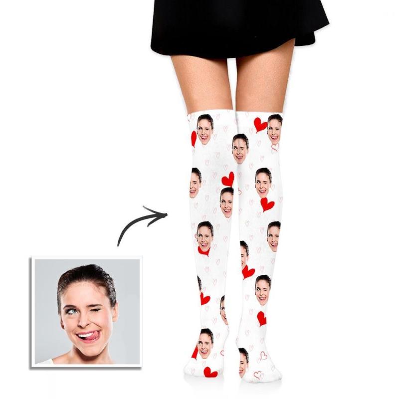 Benutzerdefiniertes Gesicht Socken, Personalisiert Kniehoch Gedrucktes Bild Adulttube Gesicht Socken mit Rot Herzen