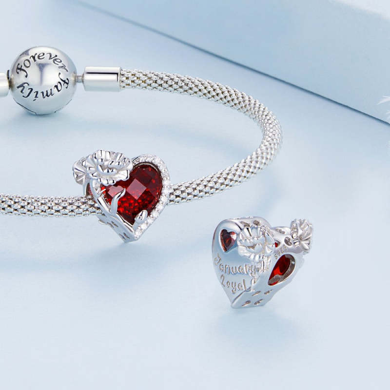 Roter Charm mit Geburtsstein Januar, Silber
