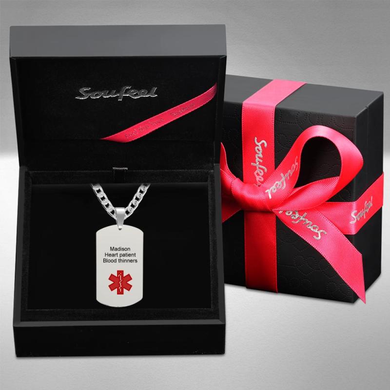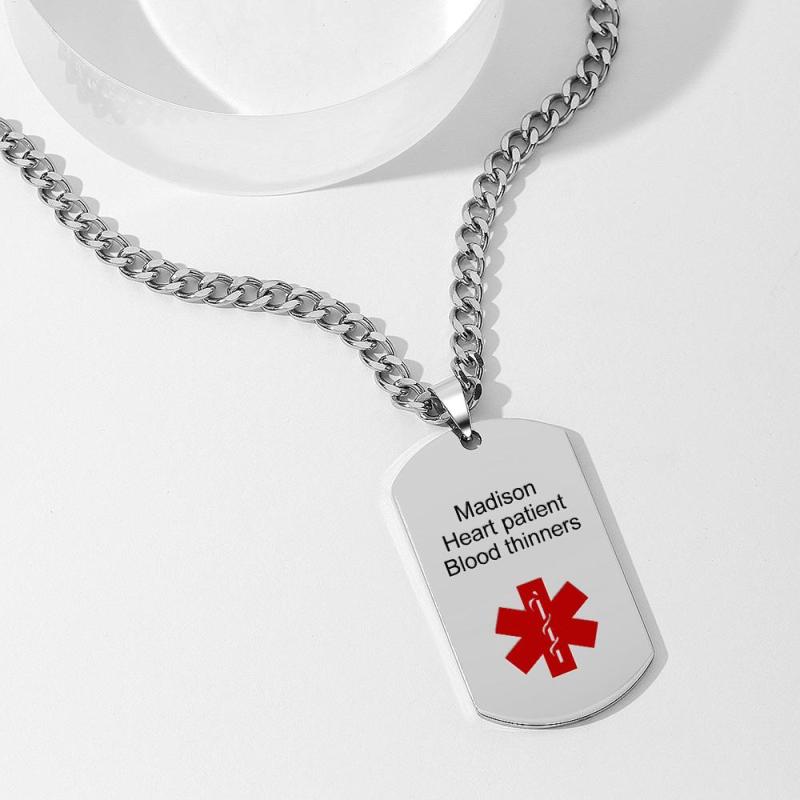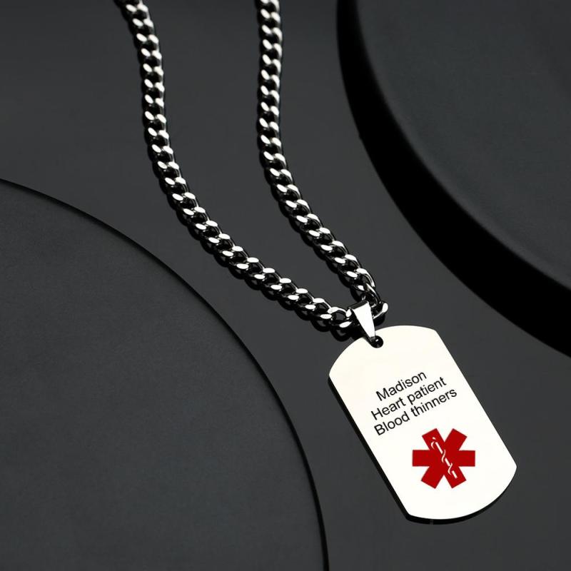 Dies ist eine medizinische Alarmkette für ältere Menschen und Familienmitglieder mit akuten Erkrankungen. Das Muster darauf ist das Erste-Hilfe-Symbol, das für das medizinische Personal praktisch ist, um die Krankheit schnell zu finden und schnell zu behandeln, wenn sich bei Familienmitgliedern mit chronischen Krankheiten ein Unfall ereignet.