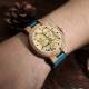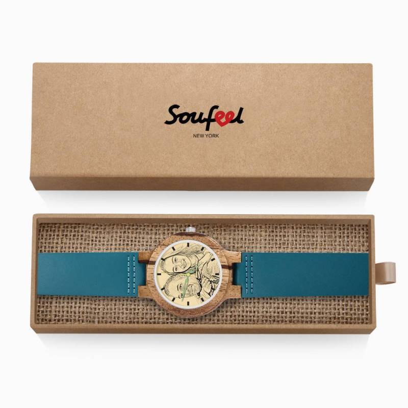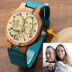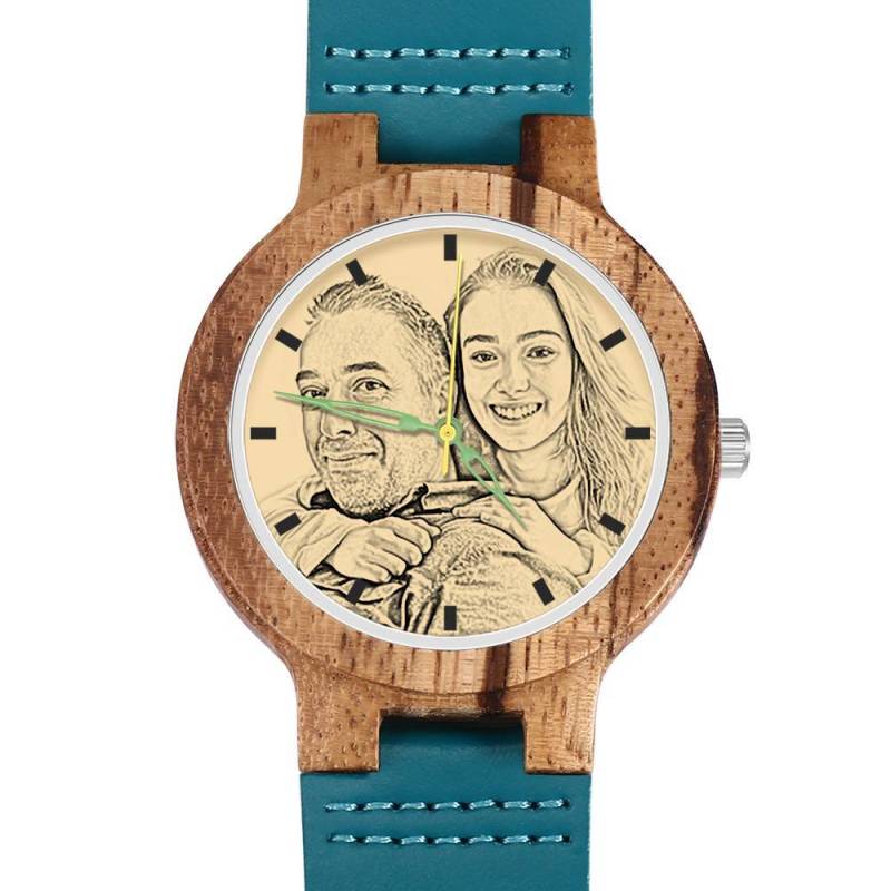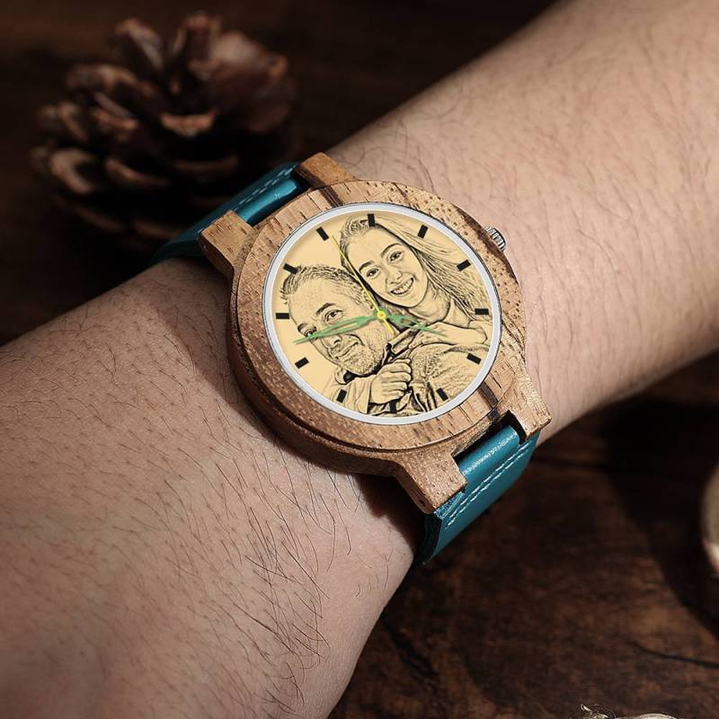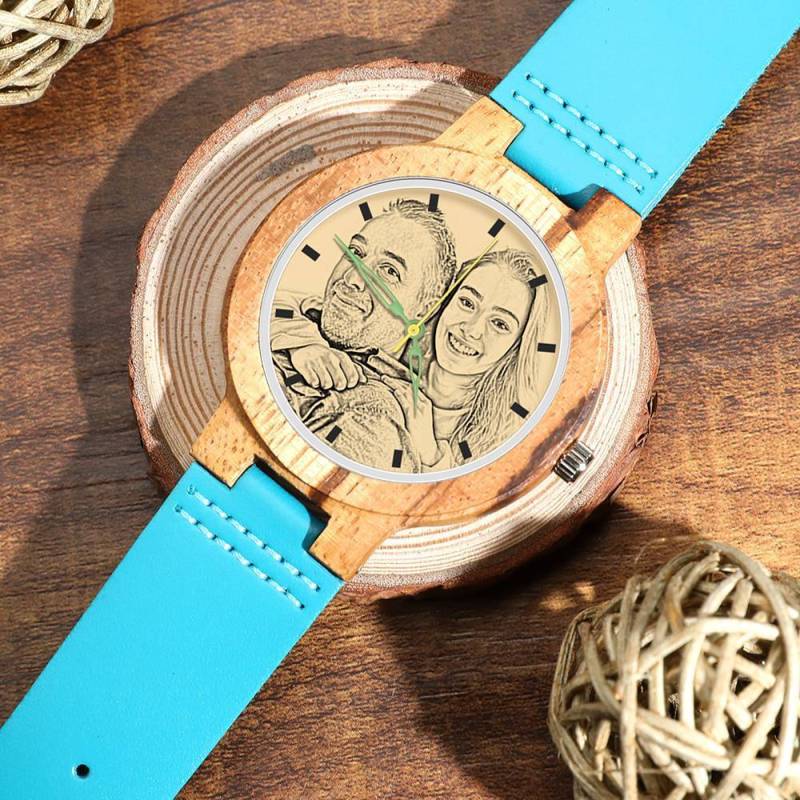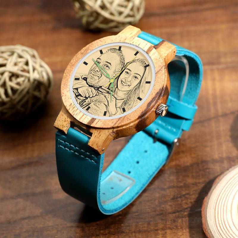 Herren Gravierte Hölzerne Foto Uhr Blaues Lederband - Zebra Holz