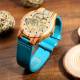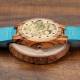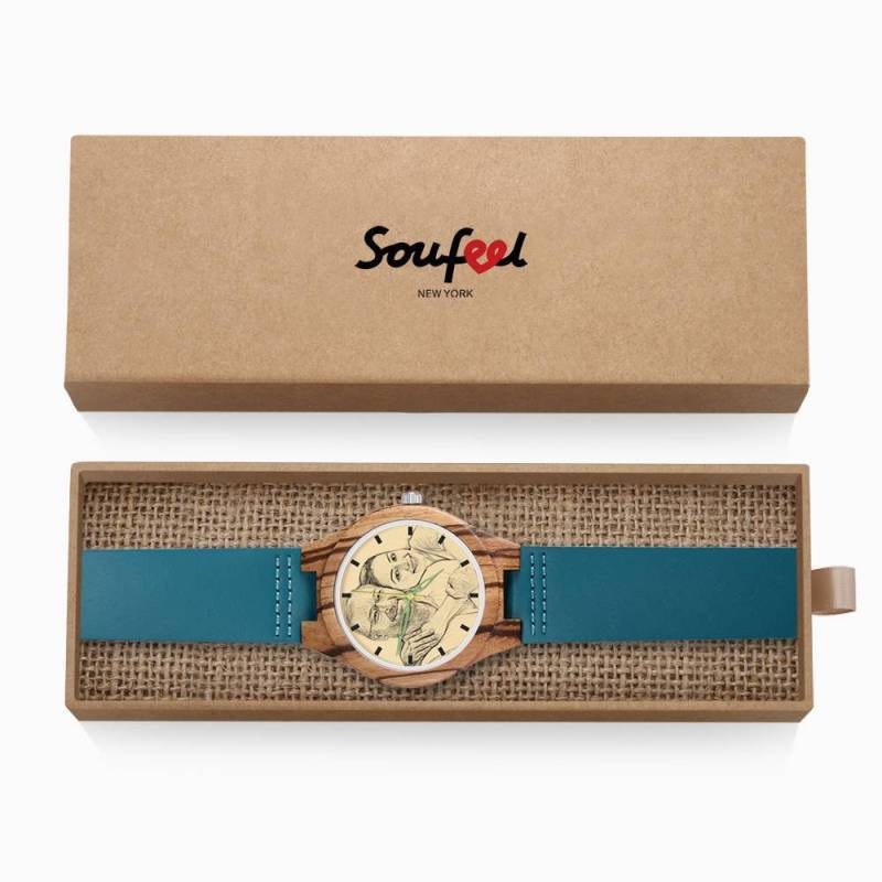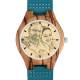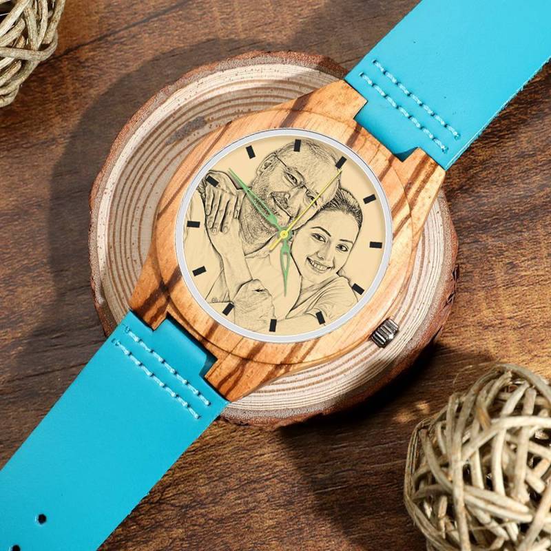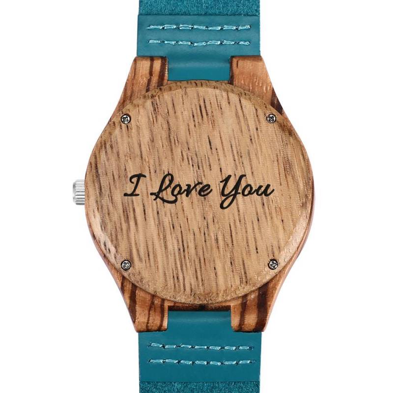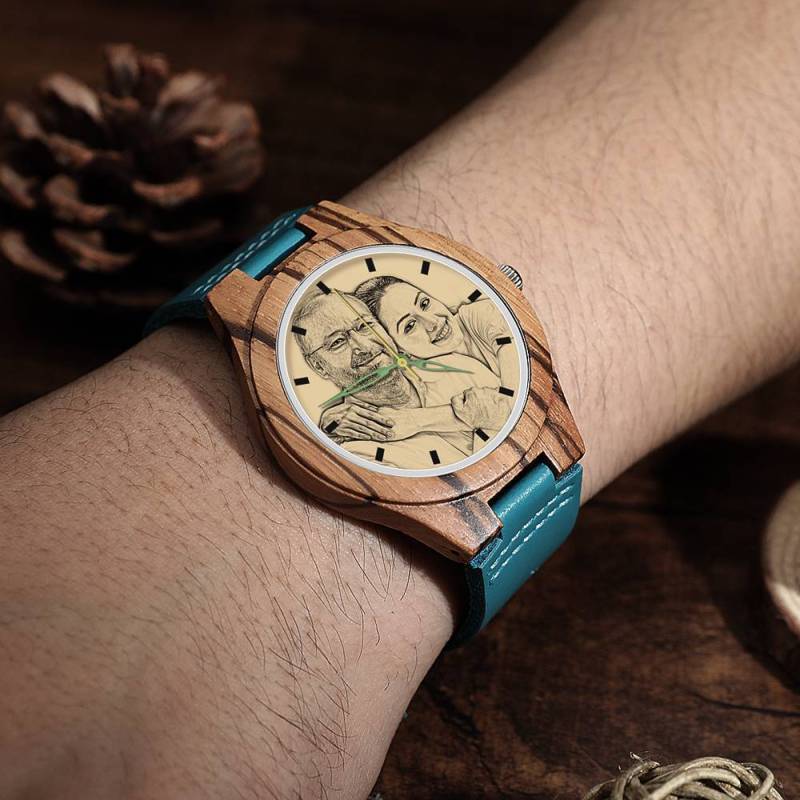 Herren Gravierte Hölzerne Streifen Foto Uhr Blaues Lederband - Zebra Holz