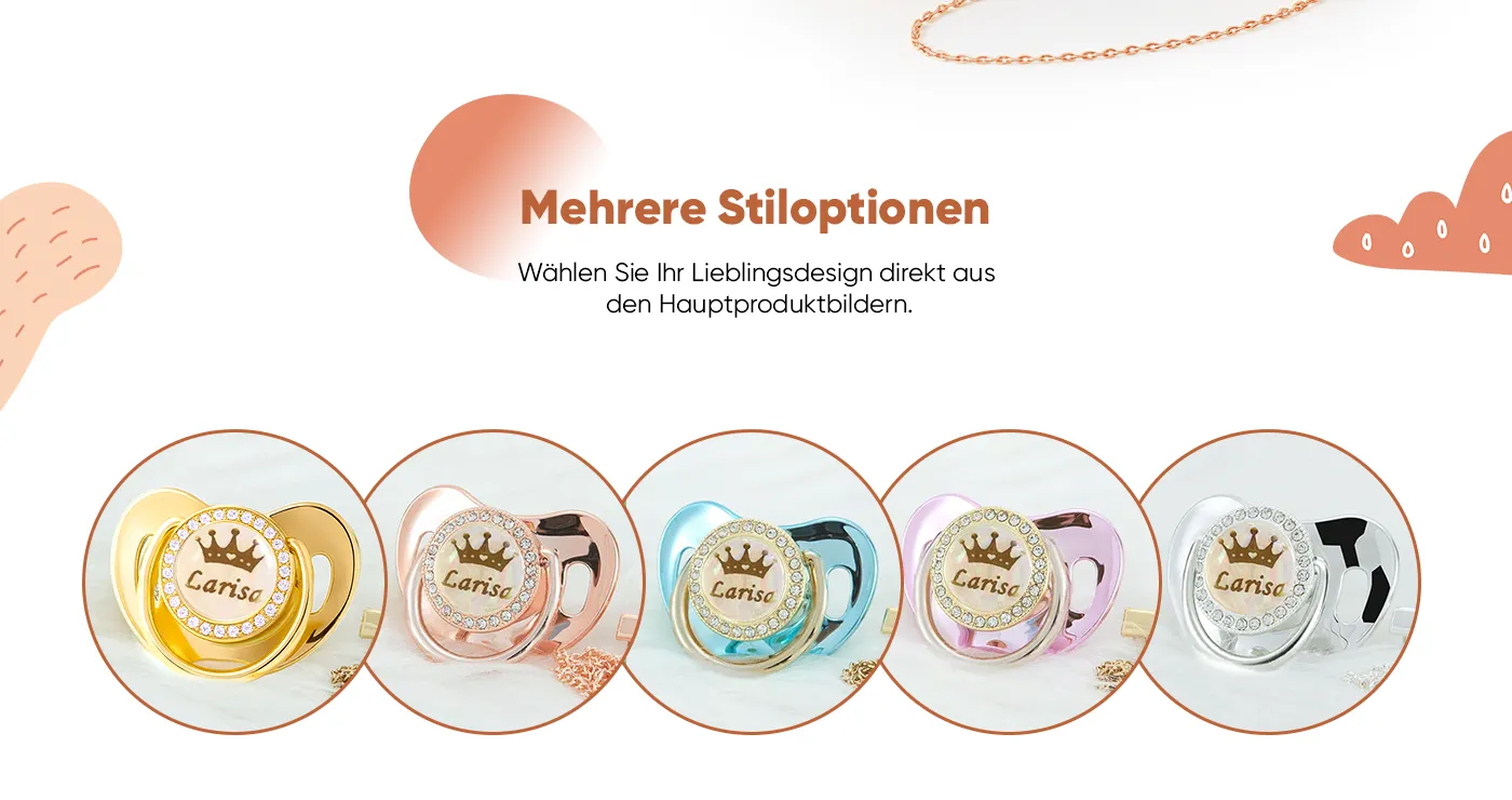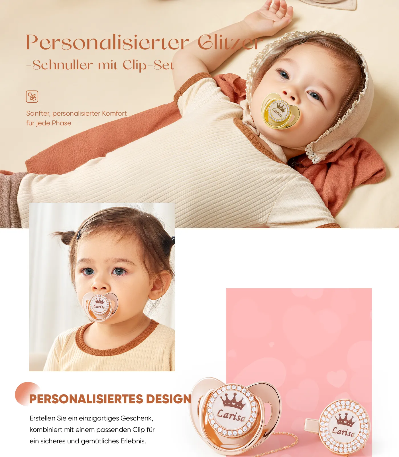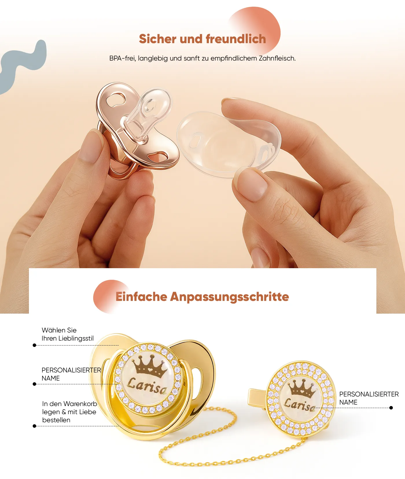 Sorgen Sie mit diesem luxuriösen, personalisierten Schnuller dafür, dass die wichtigsten Dinge Ihres Babys sicher, stilvoll und unvergesslich sind!