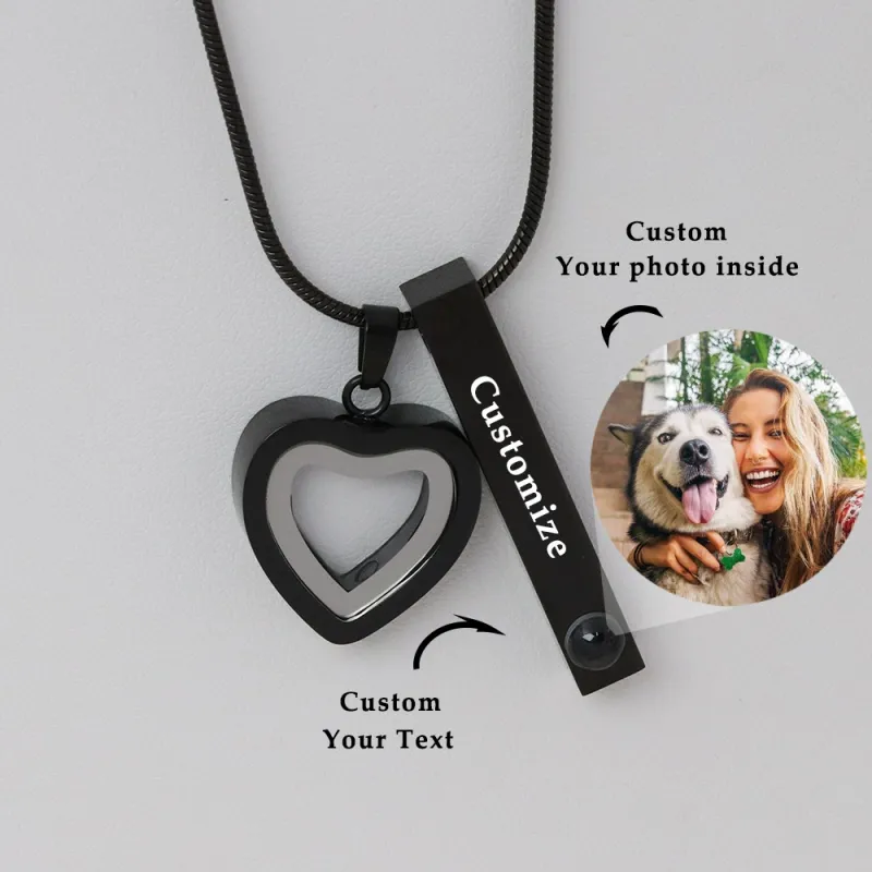 Unsere Pet Ashes Projektionskette ist eine bedeutungsvolle Kombination aus Erinnerung und Personalisierung und eine herzliche Hommage an Tierliebhaber. Dieses einzigartige Schmuckstück verfügt über einen herzförmigen Glasurnenanhänger für eine kleine Menge der Asche Ihres Haustieres, gepaart mit einer individuell gravierten Spotify-Code-Kopie und einer versteckten Projektion Ihres Lieblingsfotos. Gefertigt aus robustem Edelstahl vereint sie Eleganz und Robustheit für den täglichen Gebrauch. Ob Sie einen geliebten Begleiter ehren oder seine Erinnerung bewahren möchten, diese Kette verbindet Gefühl mit Stil – perfekt als persönliches Andenken oder aufmerksames Erinnerungsgeschenk. Eine berührende Art, die Liebe Ihres geliebten Tieres immer bei sich zu tragen.