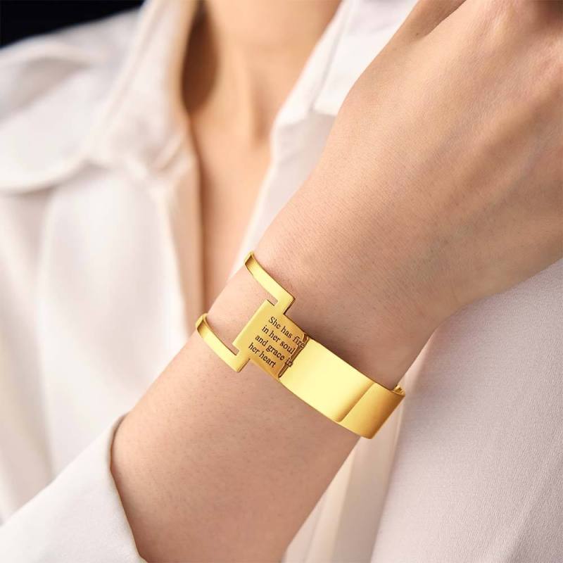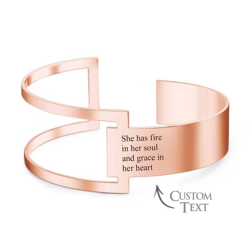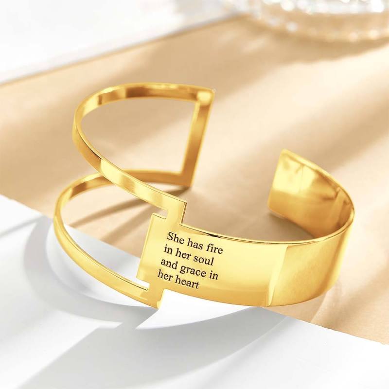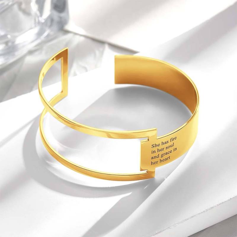 Die einzigartigen Qualitäten dieses geometrischen Manschettenarmbandes verleihen einem wirklich inspirierenden Satz eine moderne Note. Lassen Sie Ihr inneres Feuer lodern und strahlen mit dem Selbstvertrauen, das Sie erhalten, wenn Sie Ihren ganz persönlichen Stil zur Schau stellen. Diese Manschette hat ein offenes Design, das problemlos für die meisten Handgelenkgrößen geeignet ist. Das Design verfügt über einen kleinen Text, perfekt für persönliche Momente der Besinnung.